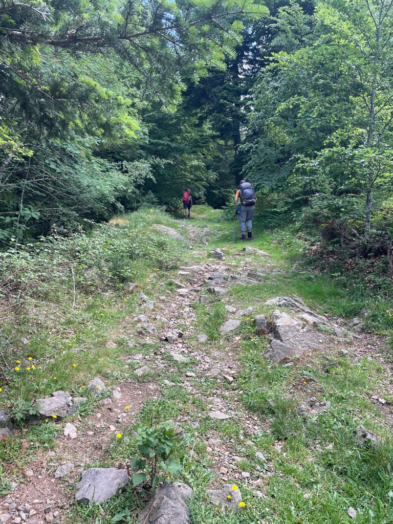 Nous devançons de peu les nuages qui montent dans la montagne, trouver les signes du GR dans le brouillard c’est pas le pied 😁