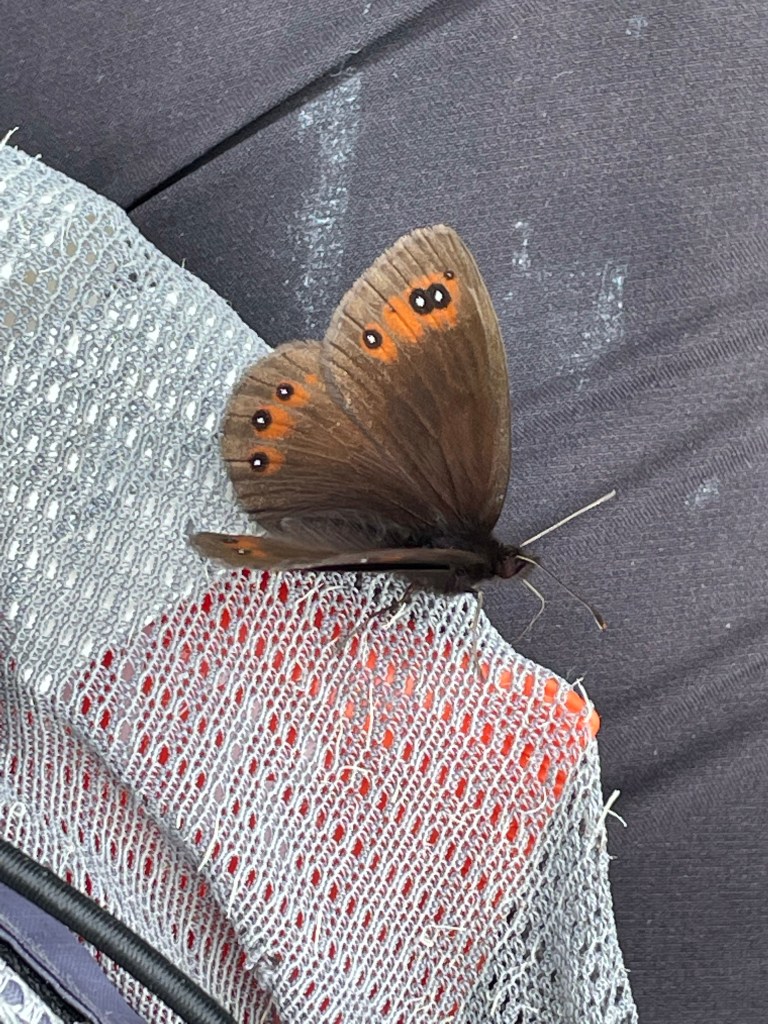 En fait la pluie a si peu mouillé le sol que nous pouvons déjeuner sans problème sur quelques pierres. Un papillon tombe amoureux de moi 😁