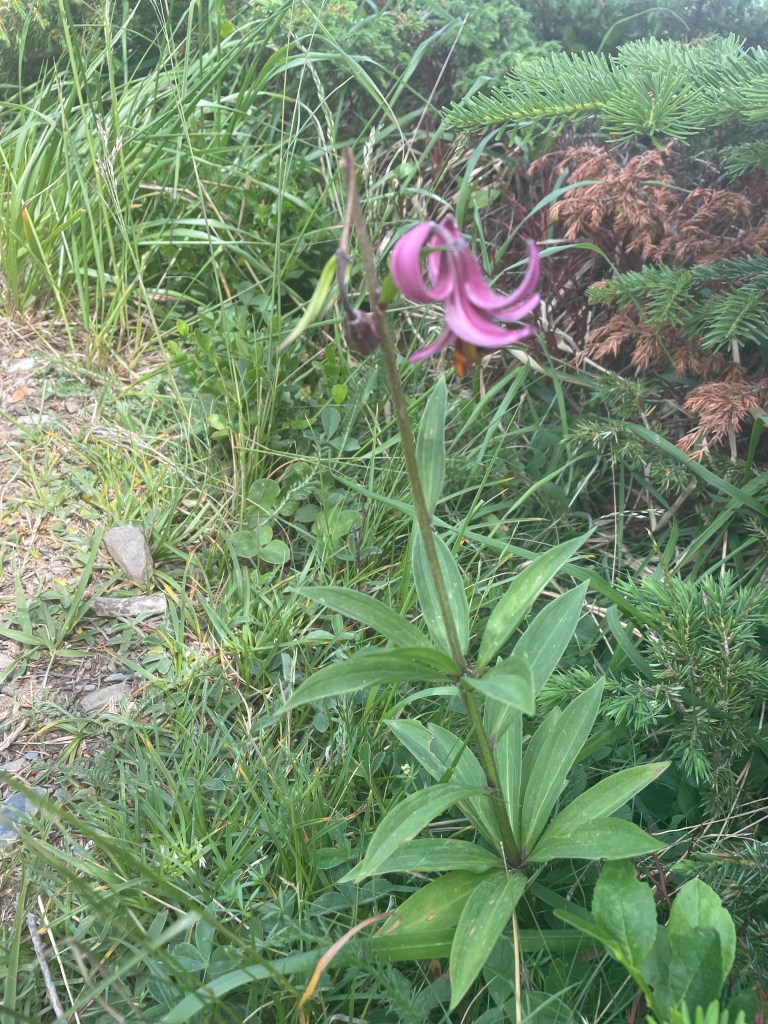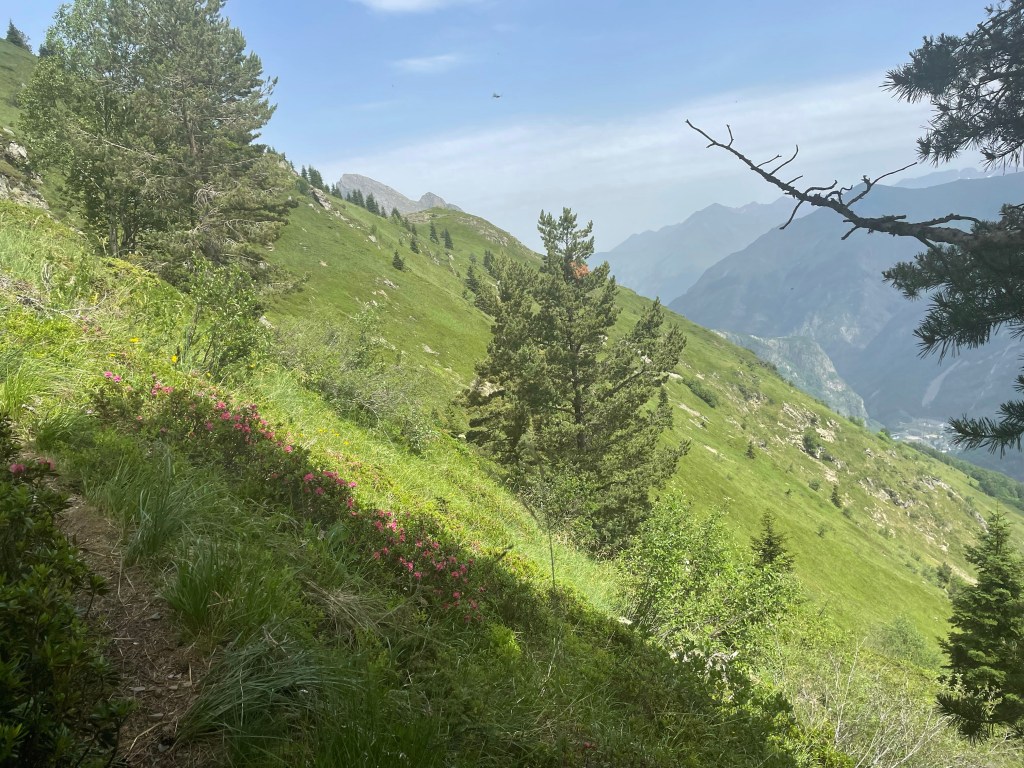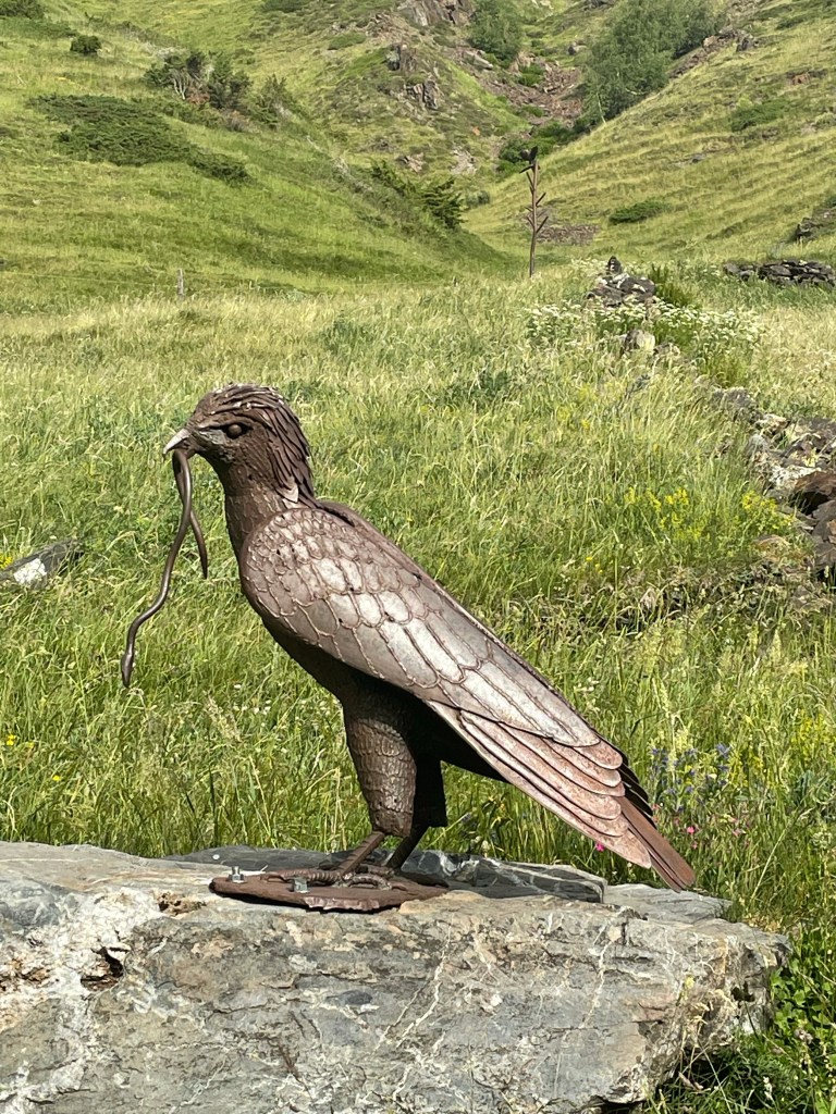 Le chemin continue à flanc de montagne, sans ombre et le soleil cogne, la canicule est aussi dans les montagnes. je galère à partir de la fin de la matinée, j’ai hâte d’arriver à la descente en forêt (je retire tout ce que j’ai dit sur l’ennui des montées et des descentes en forêt !). Mais le plateau est très long et n’a pas d’arbre…