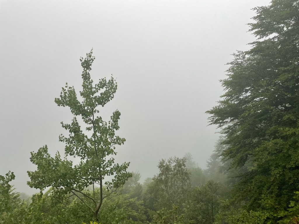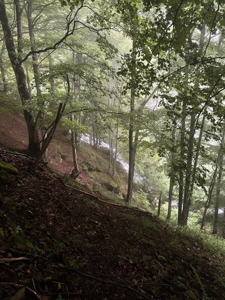 Mais ça change vite et après 20 mn de montée dans la forêt, la pluie commence à se mêler aux gouttes ruisselant des arbres. Il est temps de mettre le poncho, j’espère juste pour quelques heures…