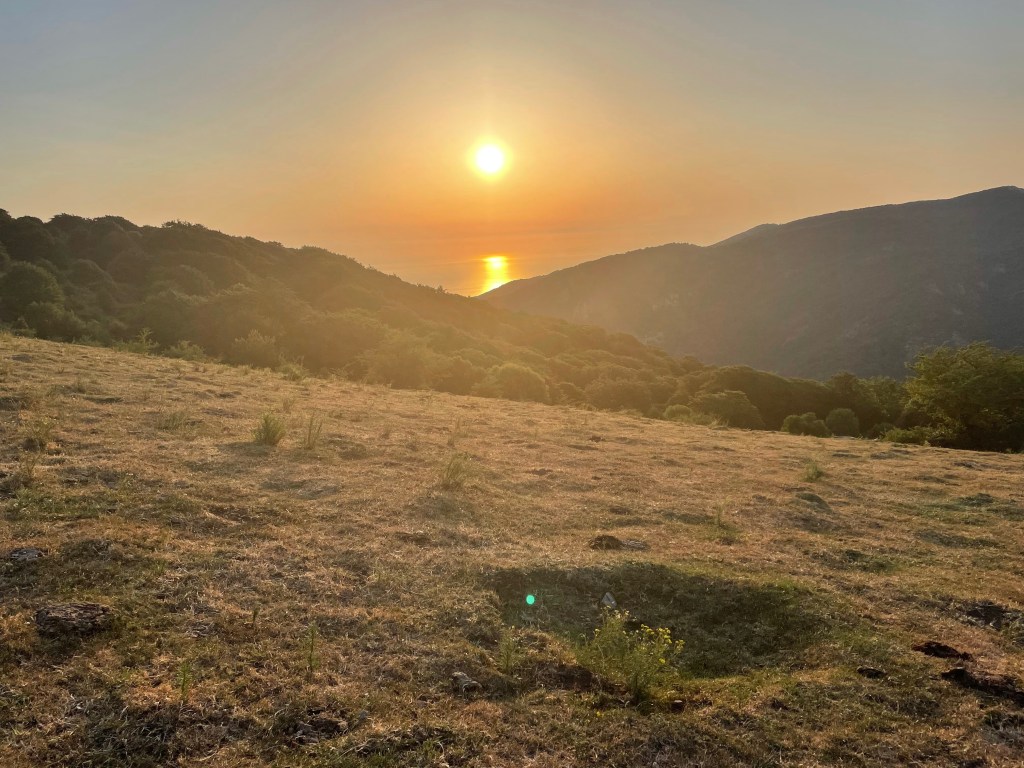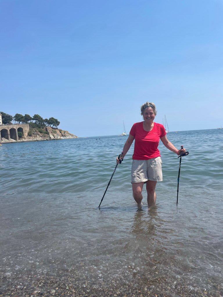 Le soleil chauffe assez vite mais reste supportable. Je commence la descente et croise une randonneuse en pause. Elle me reconnaît d’étapes antérieures et propose de marcher avec moi. C’est mieux la descente à deux… et j’ai besoin d’un photographe pour ma baignade dans la Méditerranée 😜
